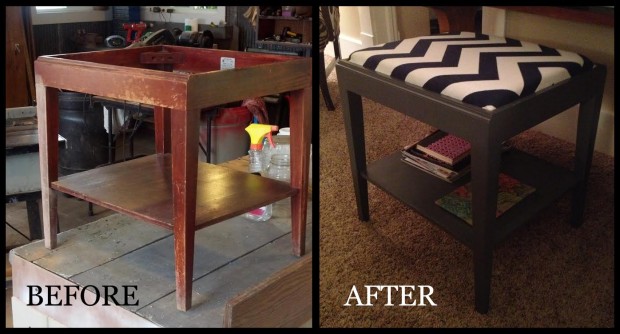 I found this gem at a local flea market a few weeks ago for $5.00! It was sturdy and had great lines!!  I immediately knew that its days as a run down side table were over and it would shine as a new ottoman! I sanded it down, slapped a fresh coat of paint on it, pulled a favorite fabric out of my massive collection, added some new foam, and threw a few staples in! WA – LA!