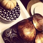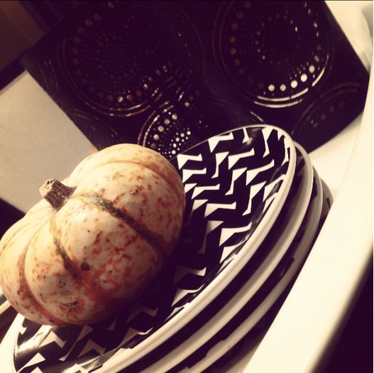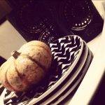 Don’t forget to address the sideboard, in this case, a well placed stack of mod black and white plates , birch logs and mini pumpkins set the tone for the rest of the dining room.