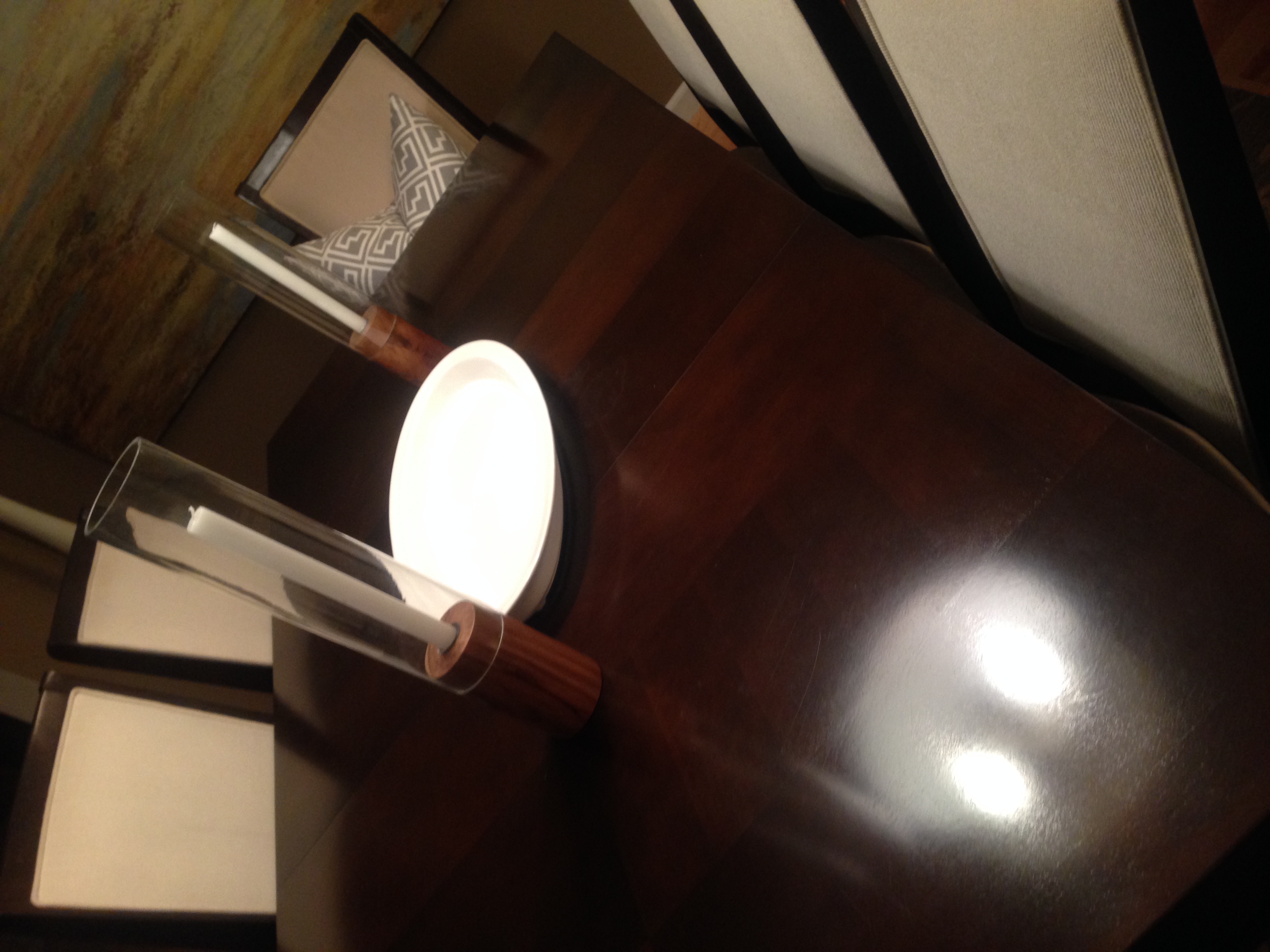 I started with a bare espresso table, I like to keep it simple and chic day to day. A simple clean white large platter finds its home in the center of our table and two wood and glass candlesticks flank the host and hostess seating arrangement.