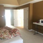 // Repainting the room in a much lighter color lightened the entire room, making the whole space feel brighter and more open. Painting a pop of peacock to the top of the angled tray ceiling gives this otherwise completely neutral space visual interest in an unexpected place,