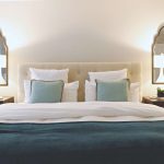 // Matching lamps and mirrors over the mis-matched nightstands create balance and harmony to either side of the headboard,