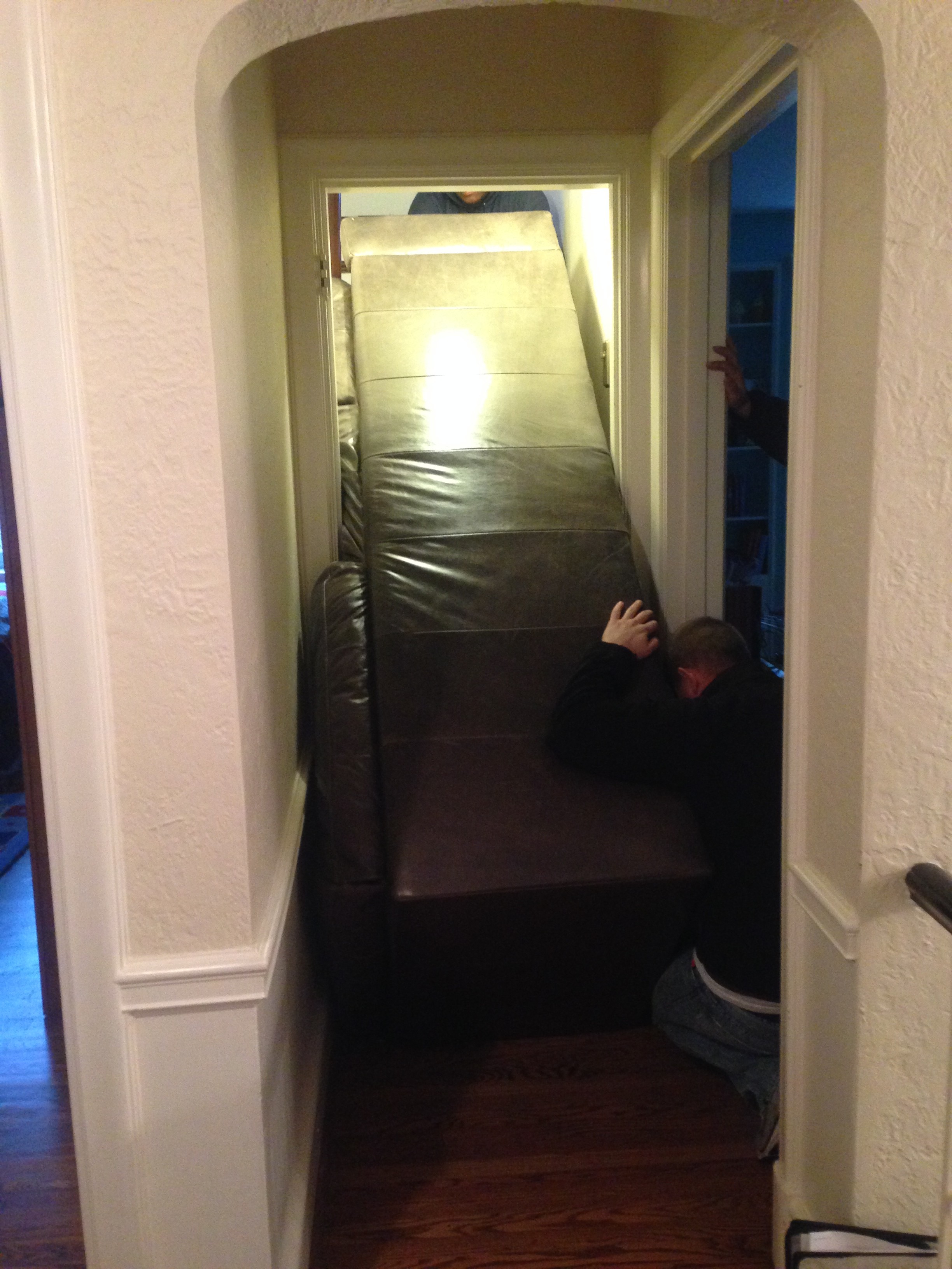 So, the day on install… Raining, a minor mis-communication between the 2 delivery companies and the fear that my sectional was not going to make it up those stairs!!  Literally we were hiding in their son’s bedroom as they took off the legs, praying this sofa would make it up